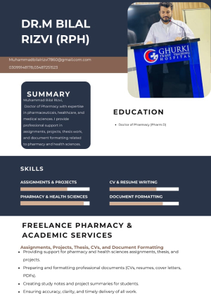 I have strong skills in pharmacy and health sciences, with the ability to support academic projects, assignments, and thesis work. I am experienced in CV and resume writing, cover letters, and document formatting, including PDF-to-Word conversion. I am also skilled in preparing study notes, summaries, and well-structured reports. My work is detail-oriented, accurate, and aligned with client requirements, and I am comfortable using tools like MS Word, PowerPoint, Canva, and Google Docs to deliver professional results.