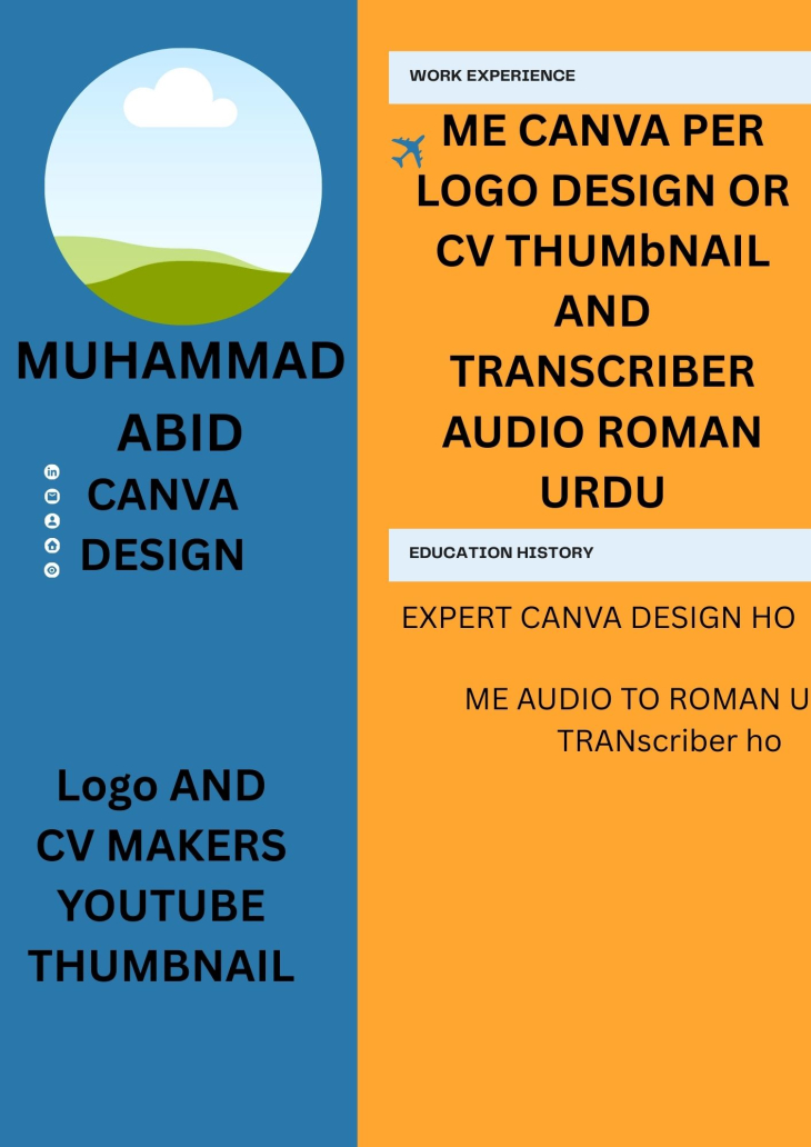 Asalam-o-Alaikum! Main professional Canva Designer hoon. Main aapke liye YouTube Thumbnails, Facebook posts, aur CV design kar sakta hoon. Kaam bohat fast hoga aur quality behtareen hogi. Ek baar moka zaroor dein."