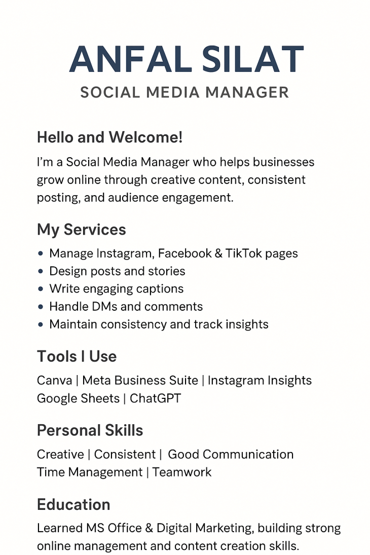 I’m here to help you grow your online presence with creative posts, consistent content, and smart marketing strategies.