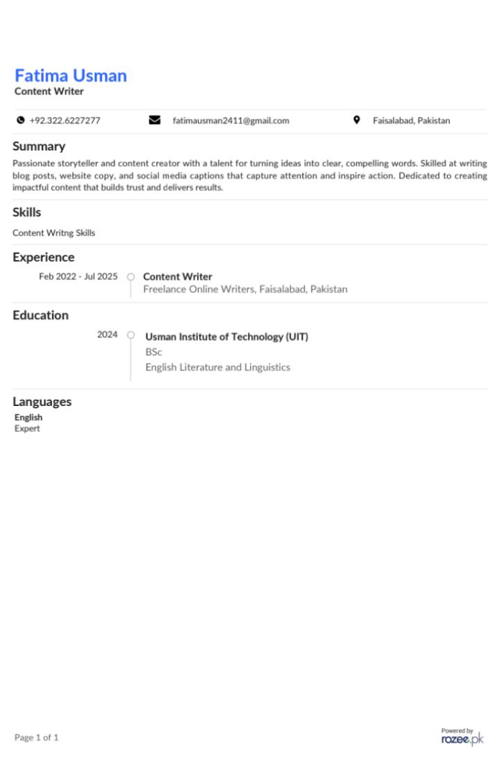 I’m a dedicated content writer who loves turning ideas into words that inspire and engage readers. With a strong passion for creativity and storytelling, I write blogs, articles, website content, and social media captions that reflect your brand’s voice and vision. My writing style is clear, compelling, and SEO-friendly — helping businesses attract more traffic and build genuine connections with their audience. Whether you need professional, promotional, or conversational content, I make sure every piece is original, well-researched, and tailored to your goals.