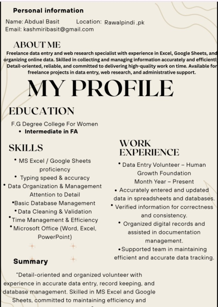 I am a professional typist offering fast and highly accurate typing services. I specialize in converting PDFs and images into editable Word or Excel documents, transcribing handwritten notes, and providing precise audio-to-text transcription. Whether it is data entry or document formatting, I ensure 100% error-free results, strict confidentiality, and on-time delivery for every project."