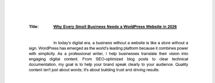 I provide professional creative writing services tailored to your needs. Whether it is a lifestyle blog, a technical guide, or an "About Us" page, I deliver polished and SEO-optimised work.