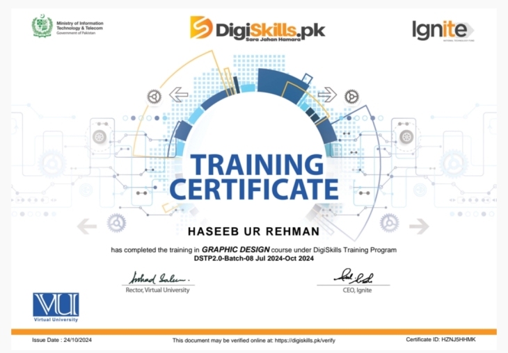 I am a professional Graphic Designer with certified training from the DigiSkills Training Program. During my course, I actively completed practical assignments and successfully delivered multiple design projects as part of the program requirements.