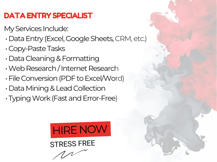 I offer professional data entry, web research, and Excel management services with quick turnaround and 100% accuracy.