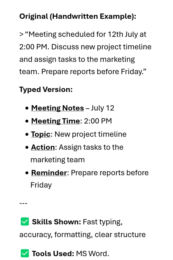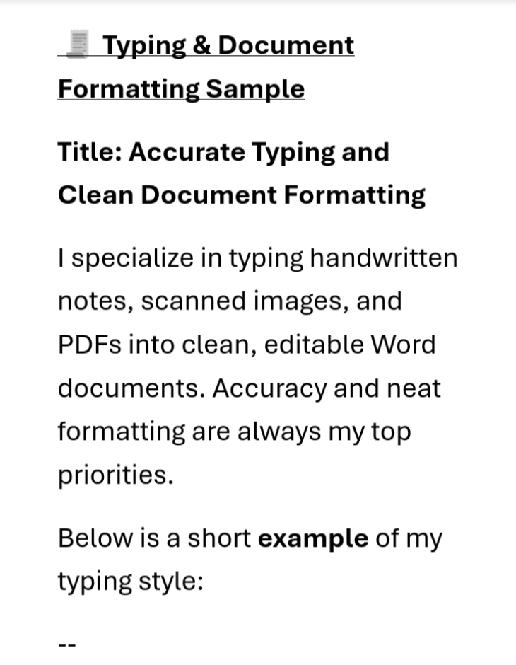 I specialize in typing handwritten notes, scanned images, and PDFs into clean, editable Word documents. Accuracy and neat formatting are always my top priorities.