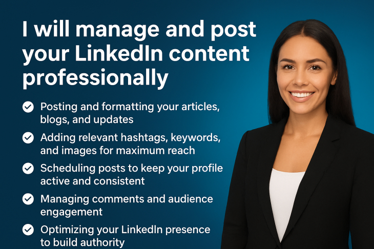 I will professionally manage and post your LinkedIn content to build your brand presence, increase engagement, and attract the right audience. My services include content posting, formatting, adding hashtags, scheduling, and engagement management. Whether you’re a busy professional, entrepreneur, or business, I’ll ensure your LinkedIn profile always looks active, consistent, and professional.