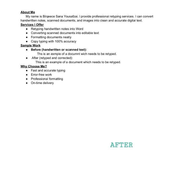 I offer professional typing, retyping, and writing services with 100% accuracy and timely delivery. Whether you need documents converted from PDF to Word, handwritten notes typed, or original content written for blogs, assignments, or business use—I ensure clear, error-free, and well-structured work.