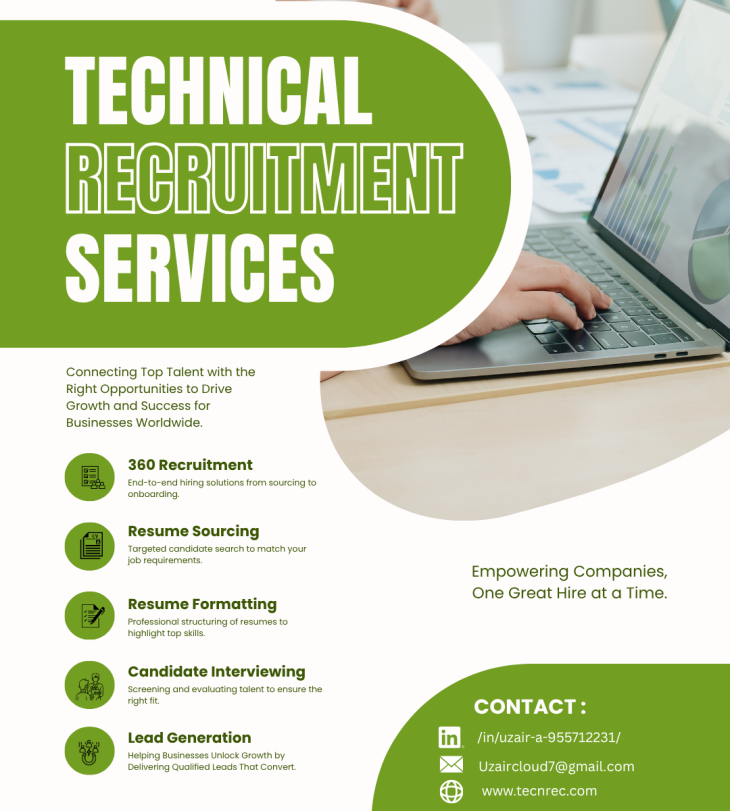 I am a Technical Recruiter with 5+ years of experience in sourcing, screening, and hiring top IT and non-IT talent globally. I provide end-to-end recruitment support, from understanding client requirements to delivering qualified candidates ready for interviews.