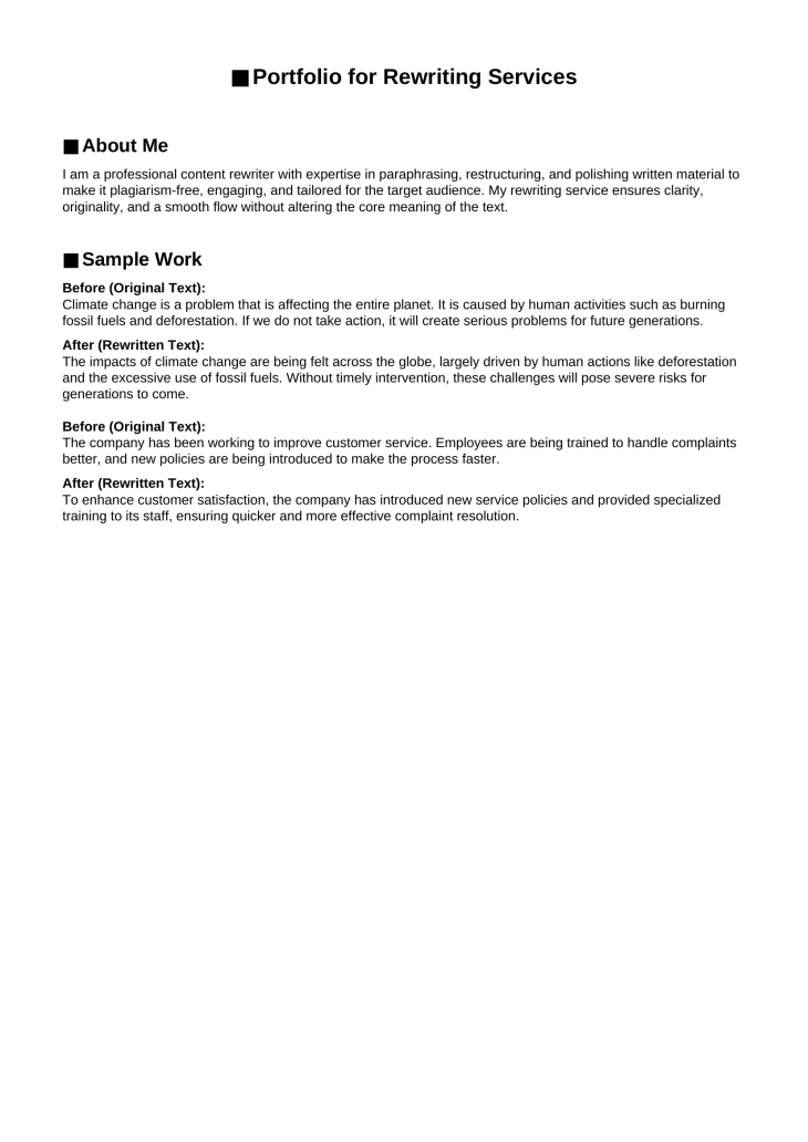 “I will professionally rewrite, paraphrase, and polish your content to make it 100% original, engaging. My service ensures improved readability, accurate grammar, and a professional tone tailored to your audience. Whether it’s academic writing. I will deliver high-quality rewritten work that maintains the original meaning while enhancing clarity and flow.”