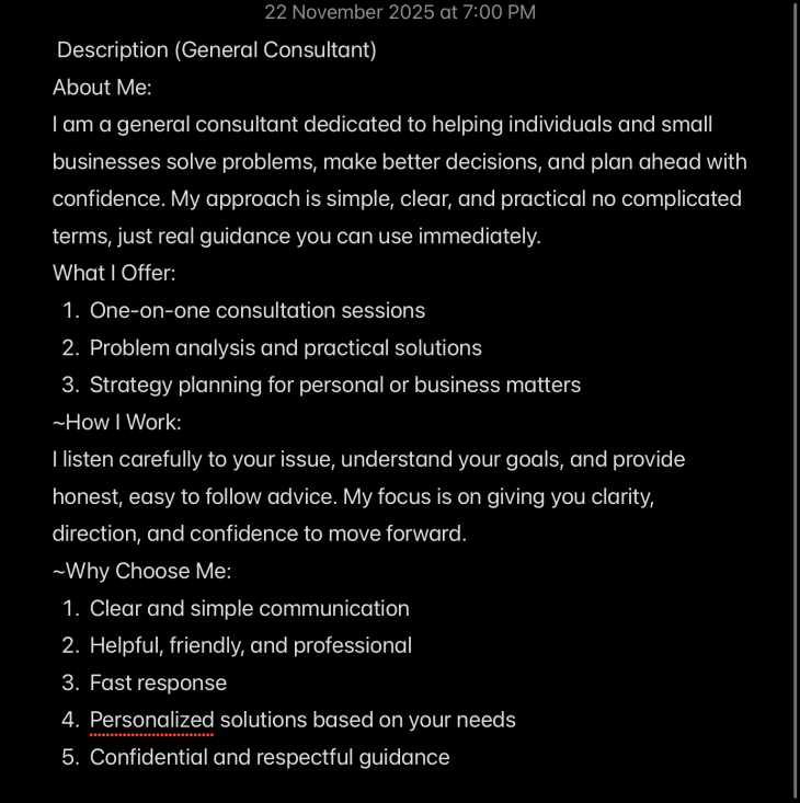I offer general consultations to help you resolve problems, plan effectively, and make informed decisions. My guidance is simple, practical and tailored to your needs. You will receive clear solutions, step by step direction, and actionable recommendations. All consultations are delivered professionally, confidentially, and with your goals in mind.