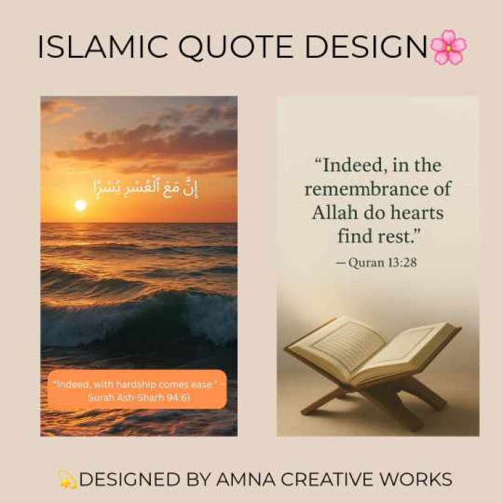 Each design will include your chosen ayah, hadith, or Islamic quote, styled with aesthetic colors and elegant typography ~perfect for Instagram, Pinterest, or Facebook pages.