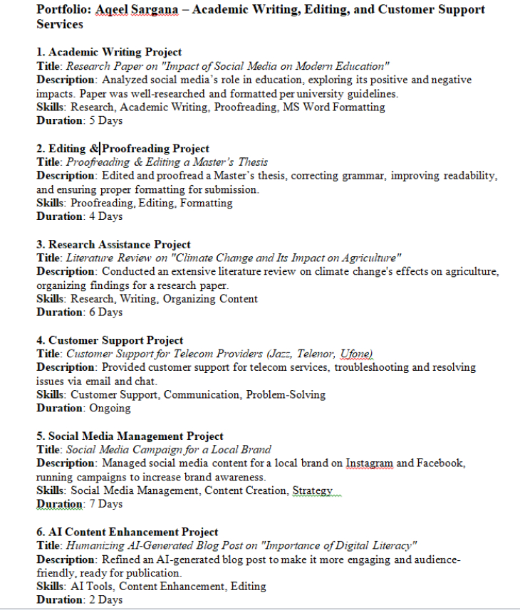 Hello! I’m Aqeel Sargana, an M.Phil. graduate in English offering a range of services in academic writing, editing, proofreading, research, and customer support. I assist with assignments, thesis, research papers, proofreading, and more. I also have experience with social media management and technology-related tasks. Whether you're looking for help with your academic work or need support with your digital projects, I'm here to provide expert help!