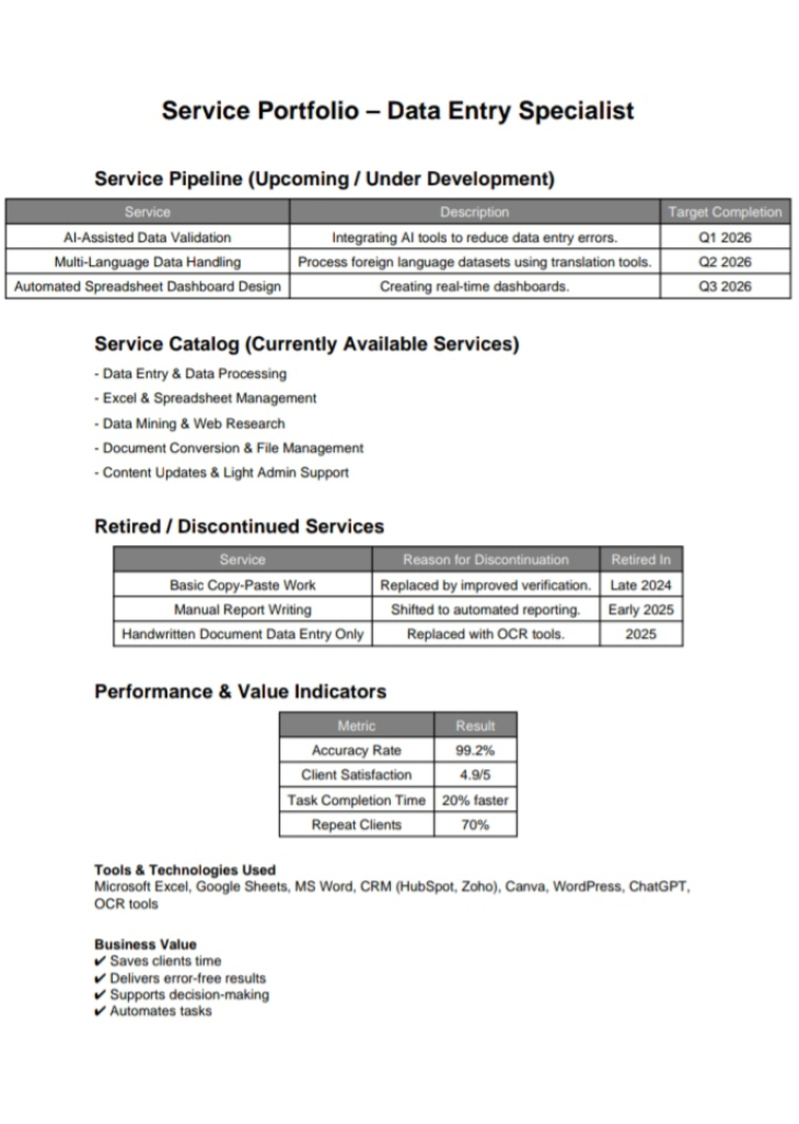 I efficiently perform data entry, research, validation, and reporting using Microsoft Excel, Google Workspace, CRM tools, AI assistance (ChatGPT), OCR conversion tools, and cloud collaboration platforms.