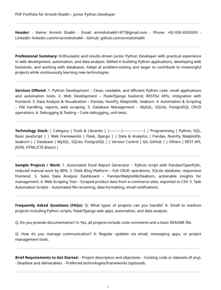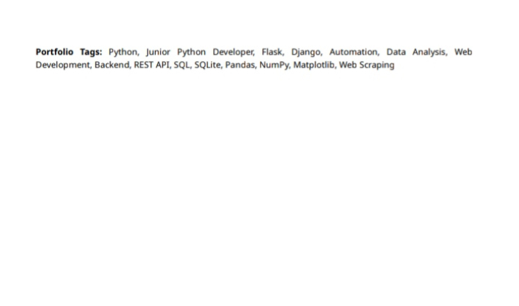 I am a dedicated Junior Python Developer with a passion for writing clean, efficient, and maintainable code. I specialize in building and supporting web applications, automating repetitive tasks, and analyzing data to provide actionable insights. I am eager to contribute to projects that require problem-solving skills, creativity, and attention to detail.