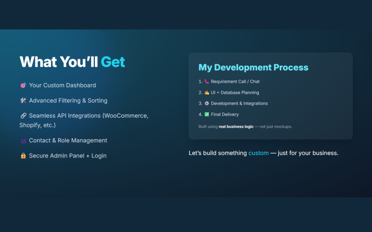 Specialized in developing custom web portals, back-end systems, and integrating APIs (WhatsApp Cloud API, Google Maps API, Social login, Shopify API, WordPress, WooCommerce, Webhooks, ChatGPT, and more). Skilled in CRMs, ERPs, Web portals and custom WordPress Plugin development.