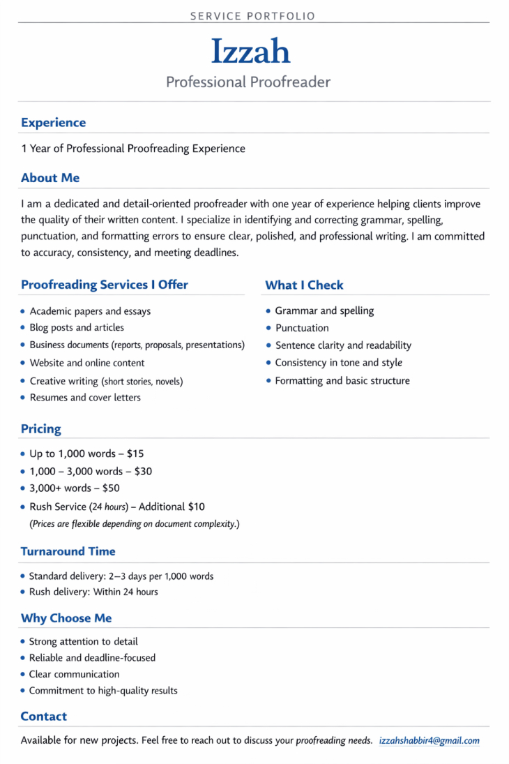 I offer professional proofreading to correct grammar, spelling, punctuation, and formatting errors while improving clarity and readability. I ensure your content is polished, professional, and ready for submission or publication.