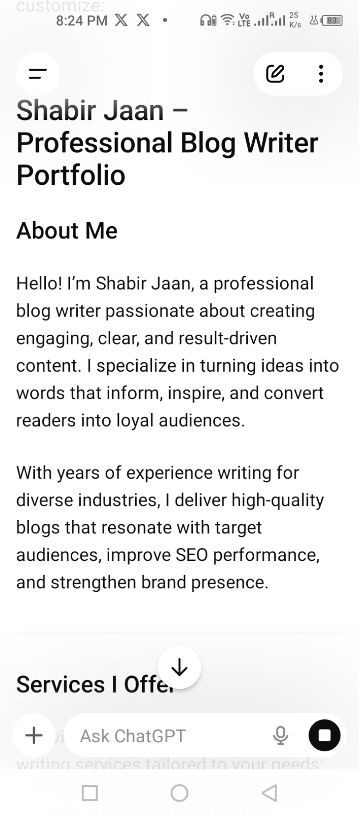 I am a professional Blog Writer & Script Writer with a passion for creating engaging, clear, and result-driven content. I turn ideas into words that inform, entertain, and convert readers into loyal audiences.