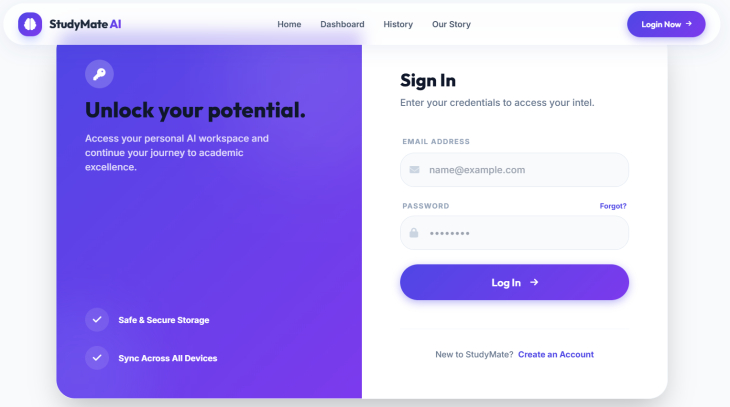 One of my featured projects is StudyMate AI, an AI-powered learning platform designed to help students study smarter through intelligent features and a clean, responsive interface.